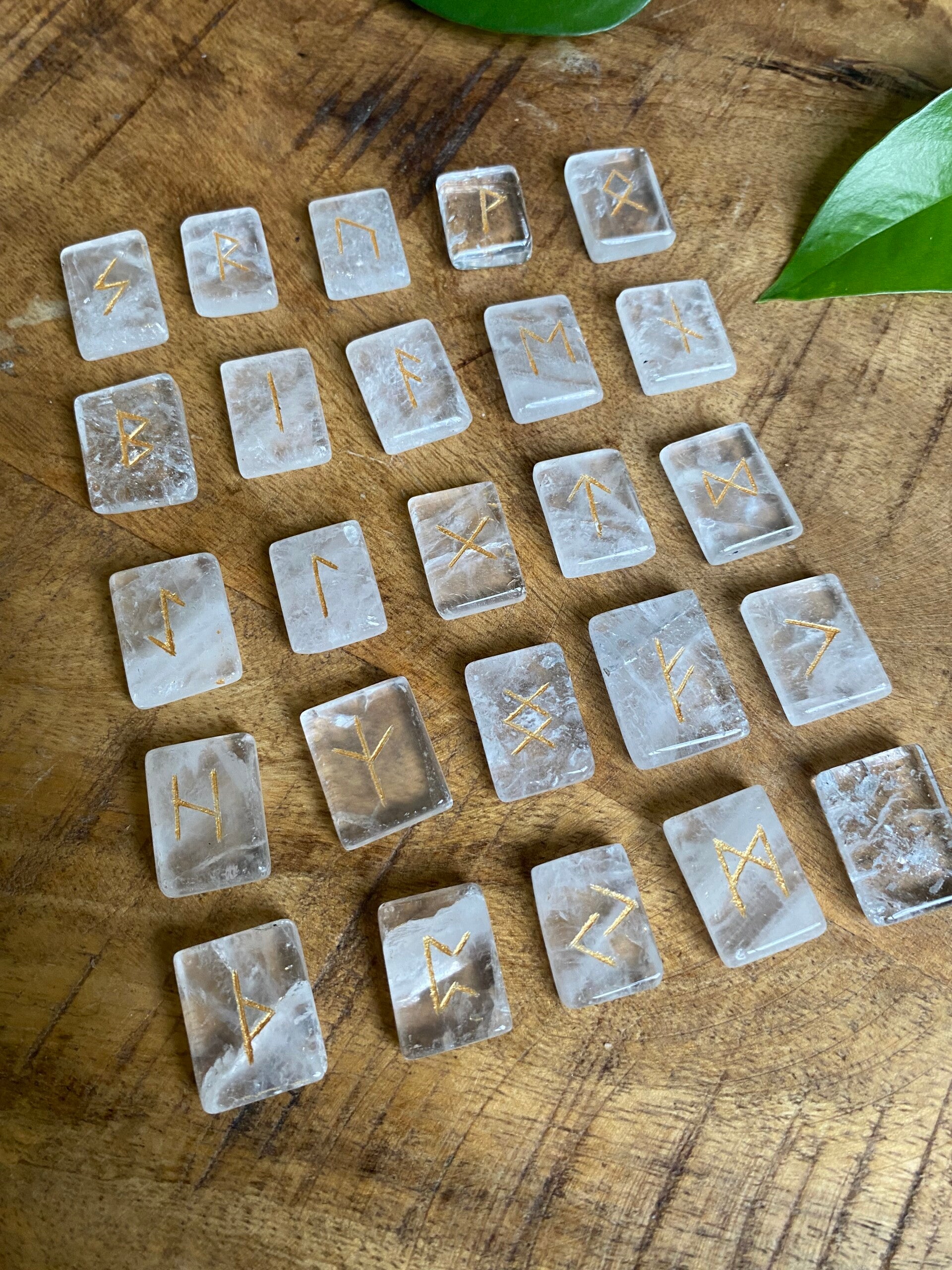 Deze prachtige runesetjes zijn verkrijgbaar in twee variaties: bergkristal en zwarte onyx. De bergkristallen setjes hebben rechthoekige steentjes en de zwarte onyx setjes bestaan uit meer rondere steentjes.